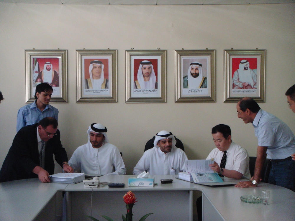 Sinoma-EC Marketing director , Mr. Wang Yi , Marketing manager ,Mr.Li Hao, Liu Zhibin and Hong Huilin witnessed this historic moment together with UAE UCCC chairman Mr.Rami, General manager Mr. Yasir, Production manager Mr. Nasser and the consultant of UCC .